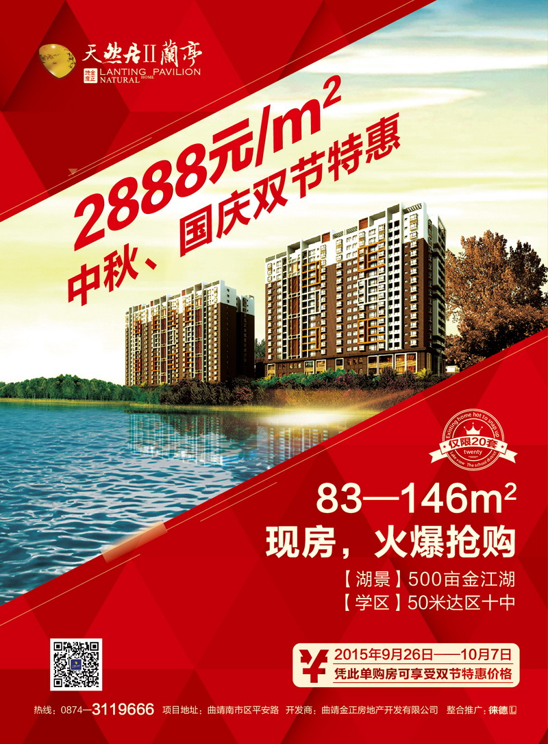 •     時至中秋、國慶雙節(jié)同慶,天然居Ⅱ蘭亭將于2015年9月26日至10月7日雙節(jié)期間傾情推出2888元/m²,不限戶型、樓層(僅限20套房源)的購房優(yōu)惠活動,房源有限,先到先得!